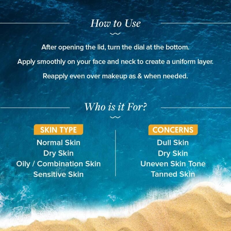 1) After opening the lid, turn the dial at the bottom. 2) Apply smoothly on your face and neck to create a uniform layer. 3) Reapply even over makeup as & when needed.
